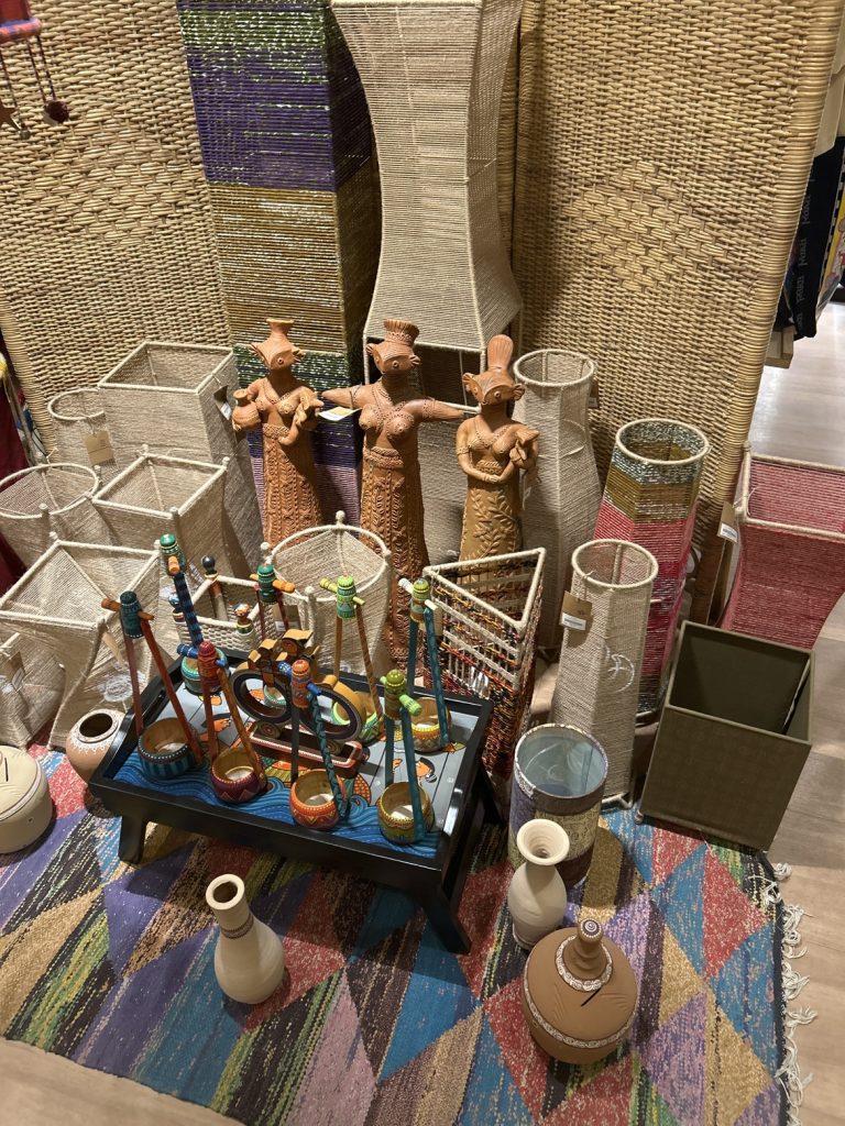お土産店にはカラフルな置物や小物入れがたくさん置いてあり、