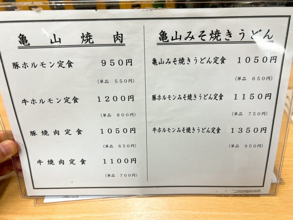 カウンター席に腰を下ろし、メニューを眺めると、シンプルながらも心惹かれる品々が並ぶ。その中でも特に目を引くのは「豚ホルモン味噌焼きうどん定食」。