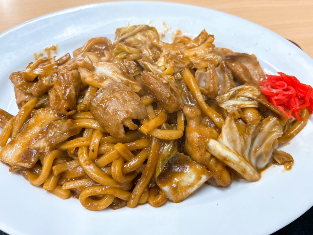 注文し、しばらく待っていると、運ばれてきた定食は、キャベツとともに炒められたうどんが盛り付けられ、豚ホルモンが艶やかに輝いている。
